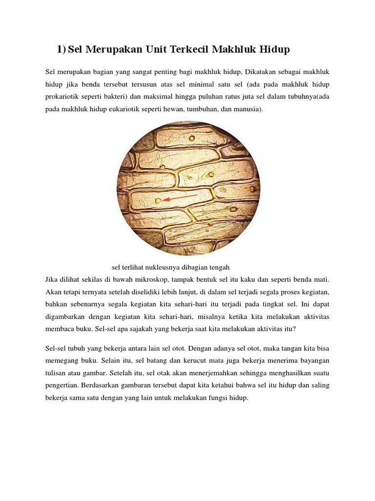 Ukuran sel sangat kecil sehingga untuk melihatnya dibutuhkan mikroskop. Setiap sel memiliki materi hereditas melakukan aktivitas metabolisme mampu tumbuh serta berkembang. Sel adalah satuan unit terkecil yang menyusun tubuh makhluk hidup. Sel merupakan unit satuanzarah terkecil dari makhluk hidup yang dapat melaksanakan kehidupan. Karenanya sel disebut unit struktural kehidupan.